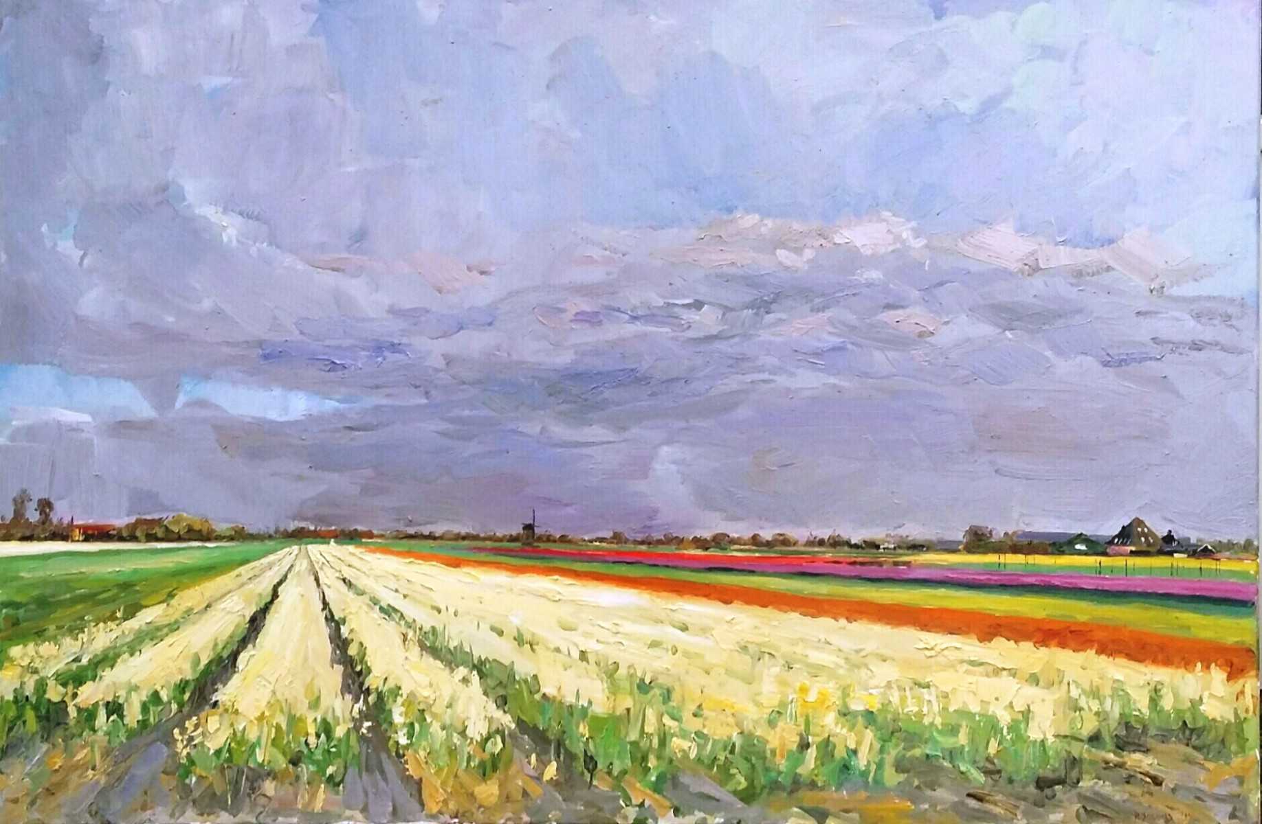 Rob Jacobs schildert bloemenvelden van Egmond op een doek van 120x80cm in Noord-Holland.