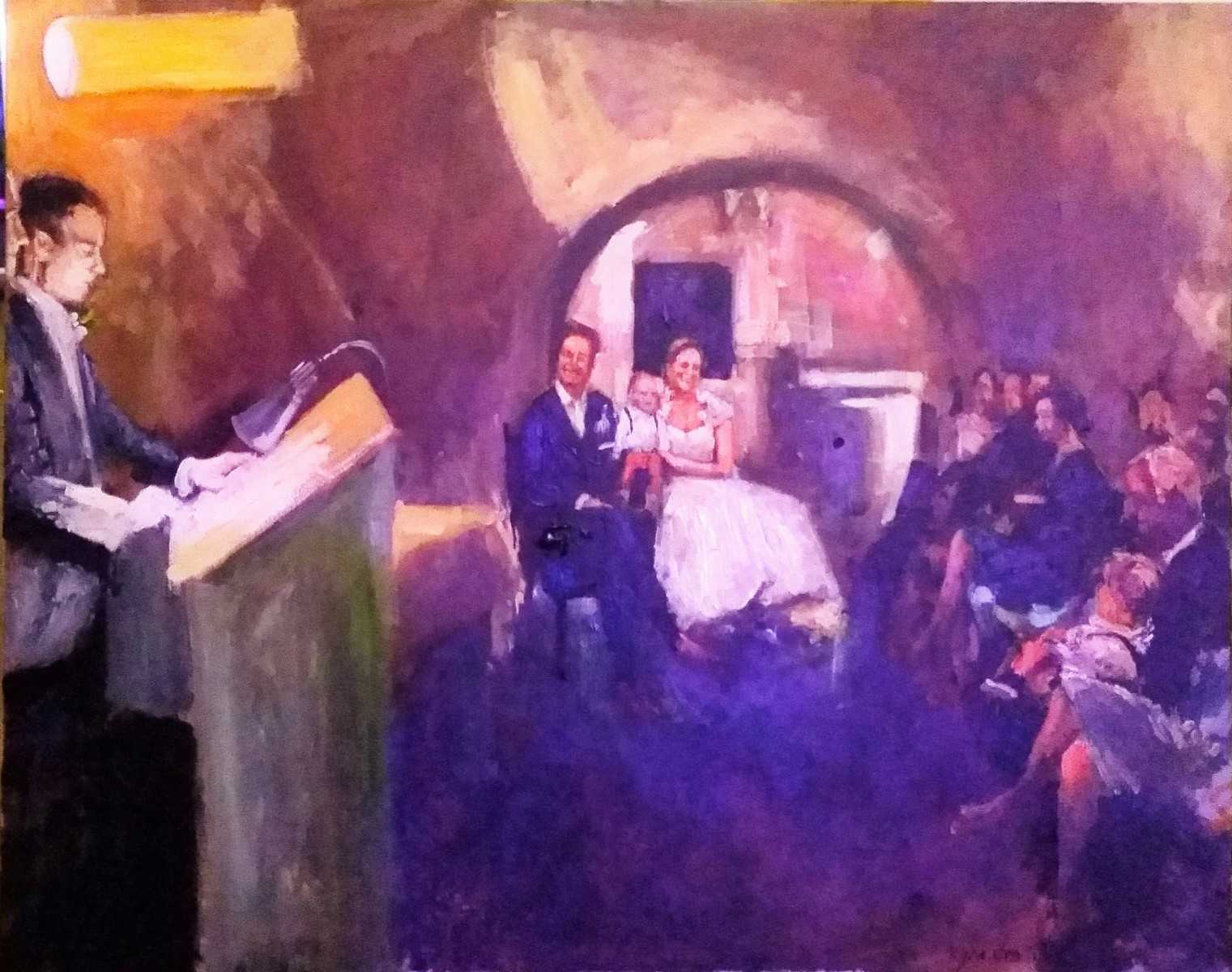 Rob Jacobs schildert doek van 80x100cm, tijdens Ceremonie, in Utrecht te Bunnik.