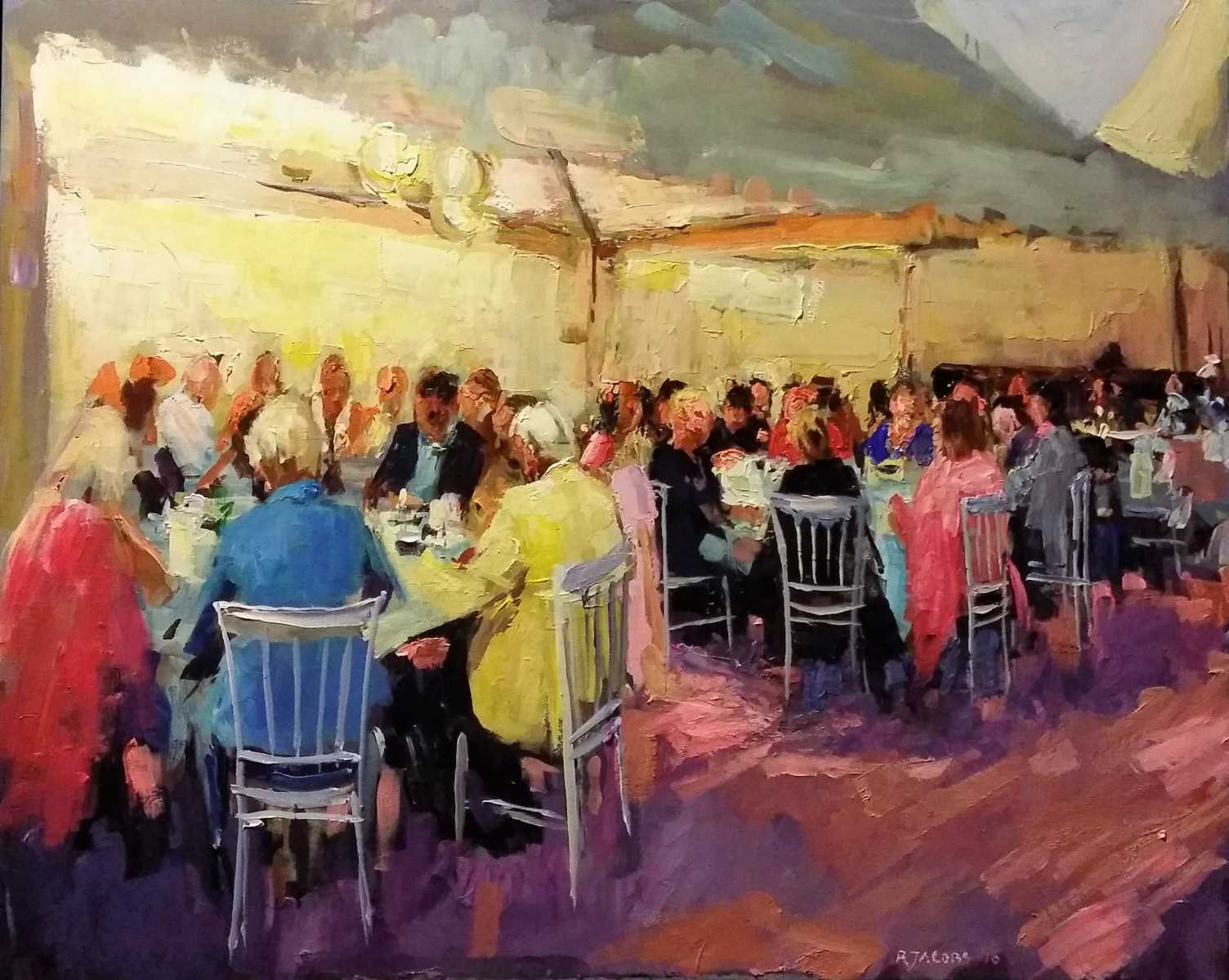 Rob Jacobs schildert doek van 100x80cm, tijdens Diner, in Noord-Holland te Bussum.