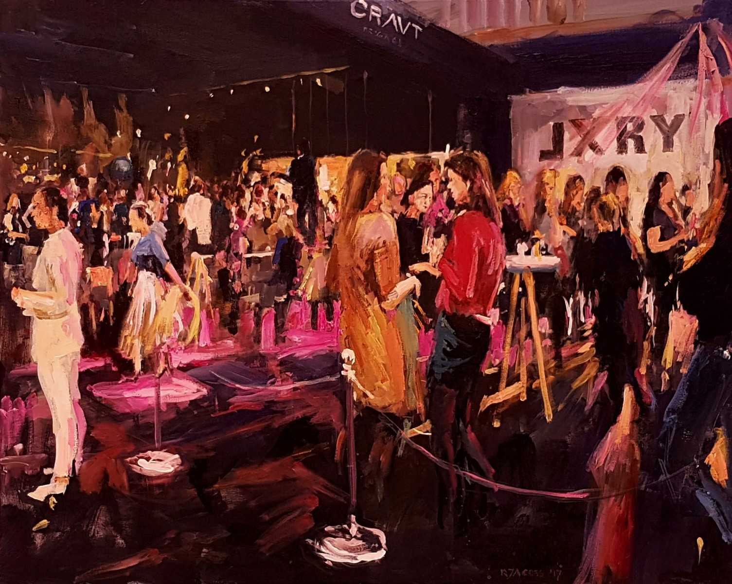 Rob Jacobs schildert doek van 80x100cm, tijdens feest, in Noord-Holland te Amsterdam (LXRY).