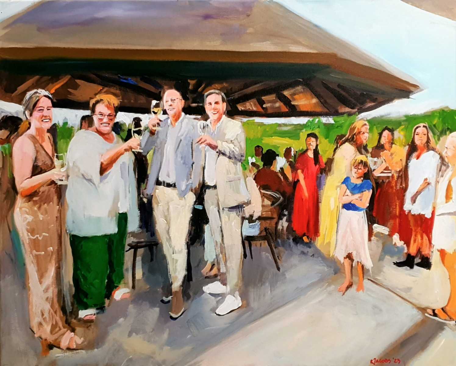 Rob Jacobs schildert live tijdens de jubileumviering van Hannah Smit in Ammerzoden, Gelderland, op een doek van 80x100cm