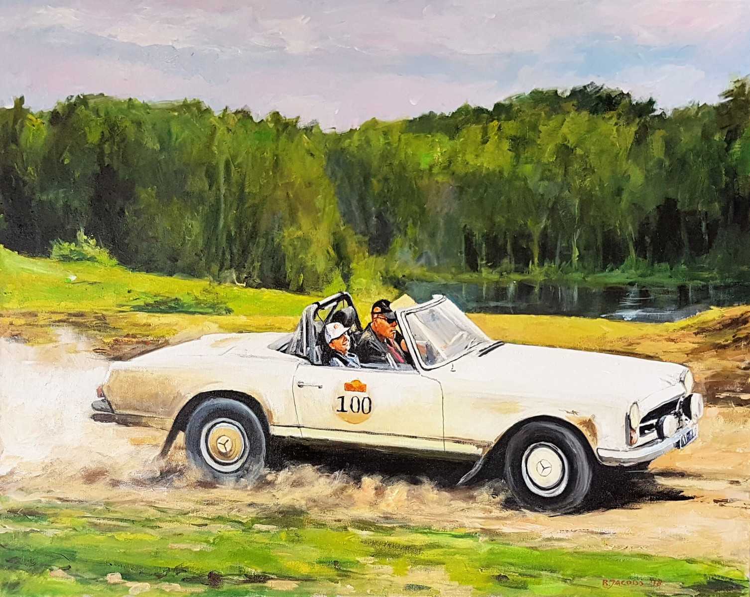 Rob Jacobs schildert doek van 80x100cm, tijdens racen, in Noord-Brabant te Eindhoven.