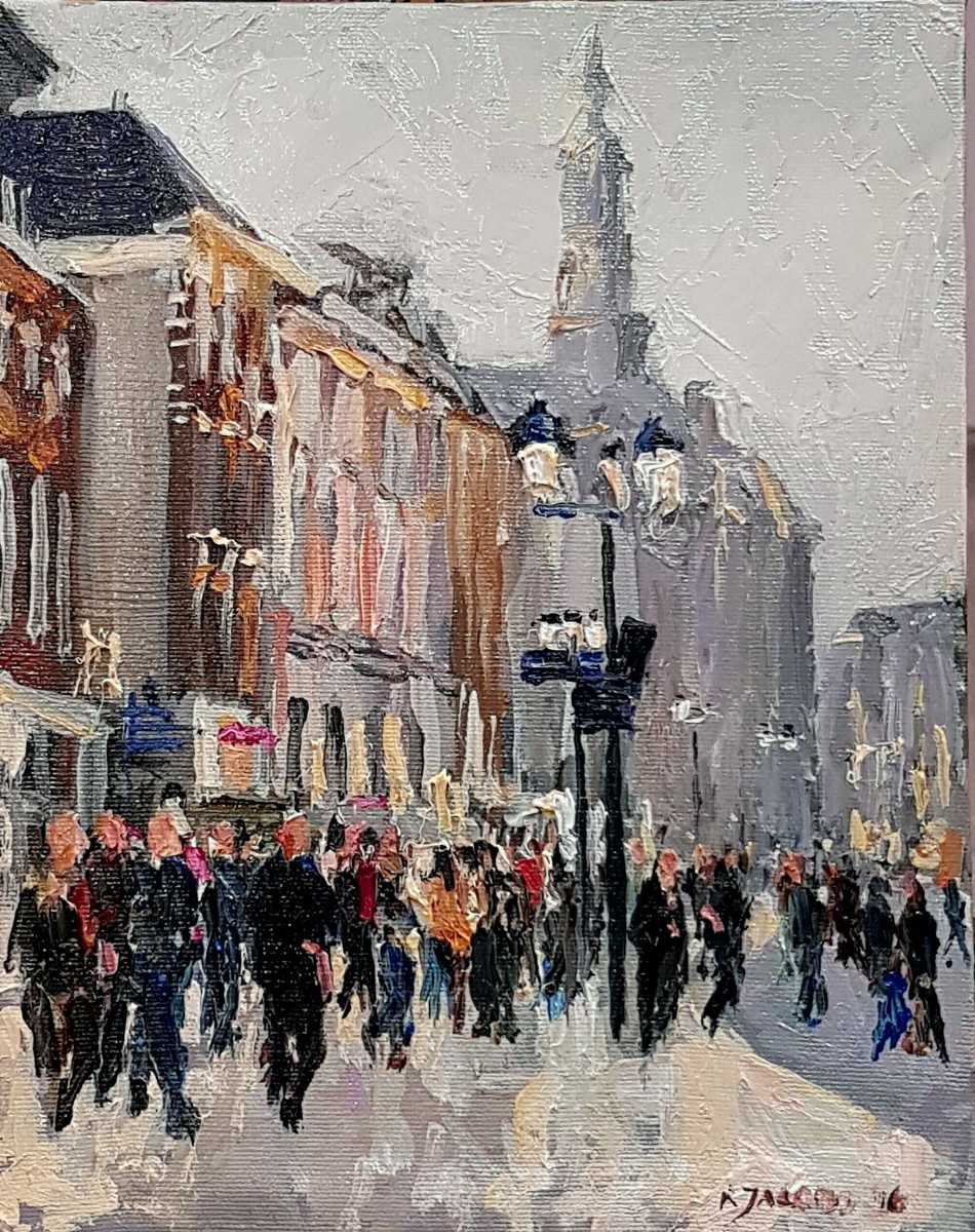 Rob Jacobs schildert doek van 24x30cm, van het Stadsbeeld.