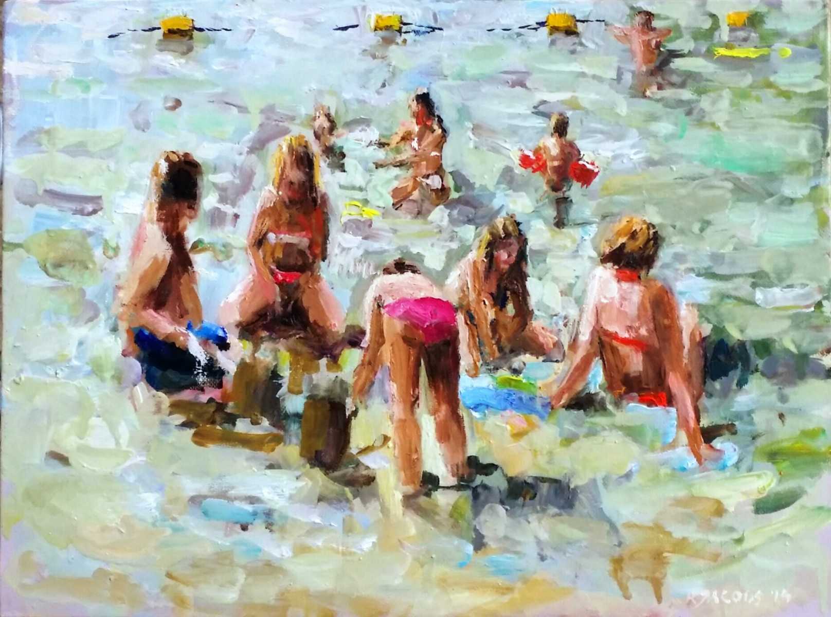 Rob Jacobs schildert doek van Strand bij Engelermeer, zwemmen.