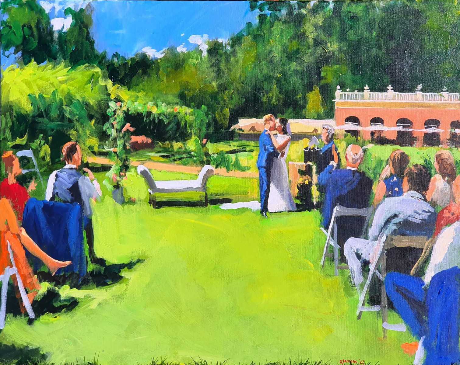 Rob Jacobs schildert doek van 80x100cm tijdens de trouwceremonie in Arnhem, Gelderland.